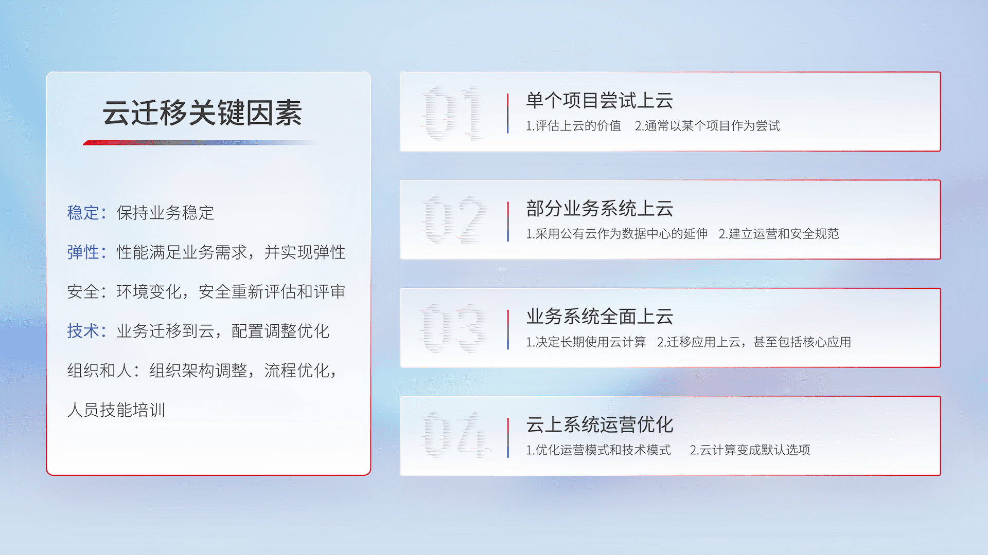结合实际业务,,,从规划设计、、云平台选型、、、、云原生改造、、、、数据迁移、、、、集成交付,,迁移全过程为客户识别最佳上云路径,,,,做好风险识别管理,,设计网络架构、、、、身份权限、、、安全审计合规、、操作审计、、日志审计、、监控告警策略、、多站点容灾设计等,,,对云上基础设施进行整体规划,,提升IT治理水平,,以满足弹性、、、高可用、、、高性能的需求。。。