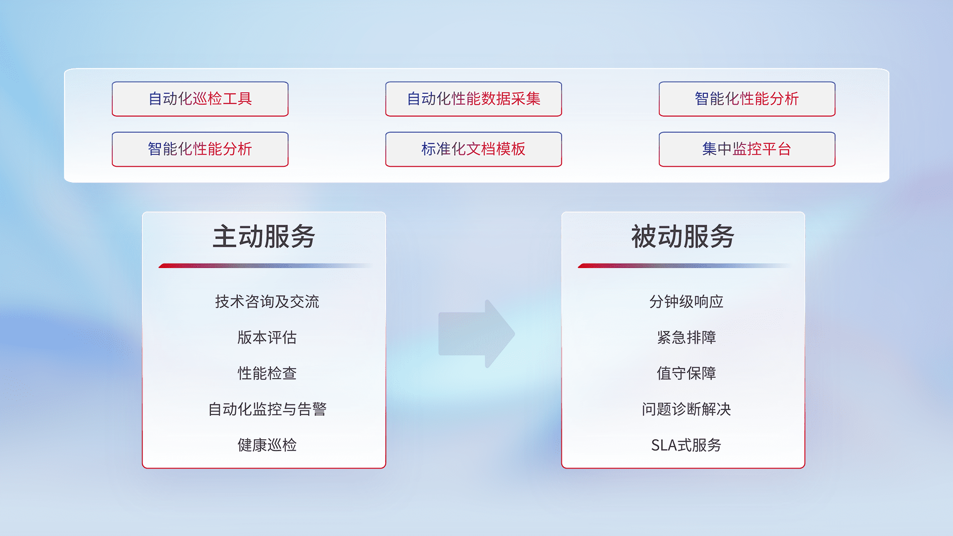 智能化工具和标准化文档,,,保障服务质量,,,提供主动服务(包含技术咨询、、、、版本评估、、性能检查、、自动化监控与告警、、健康巡检)和被动服务包含(分钟级响应、、、紧急排障、、值守保障、、、问题诊断解决、、、、SLA服务)。。。。